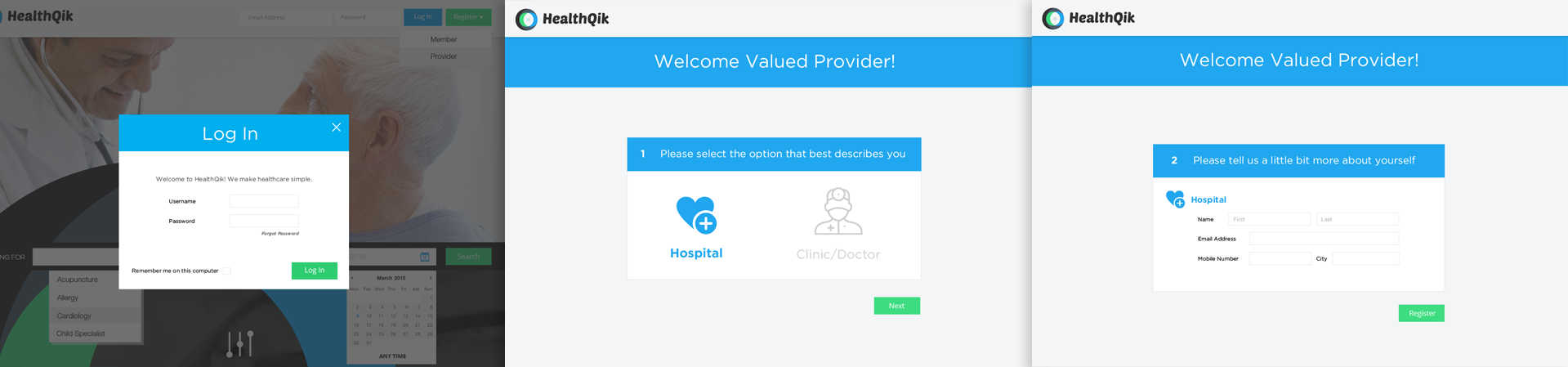 The client's objectives for the homepage changed frequently, but we ended up placing heavy focus on Patients and Doctors and their conversion to registered HealthQik members. We wanted the homepage to feel inviting for both user types, and give them a taste of what they could have access to by becoming a member. A non-registered user could learn more about benefits, browse informational articles on healthy habits, and could even begin the process of booking an appointment by searching for a doctor (by name, location, or ailment/specialty). Below is an example of one iteration of the system.